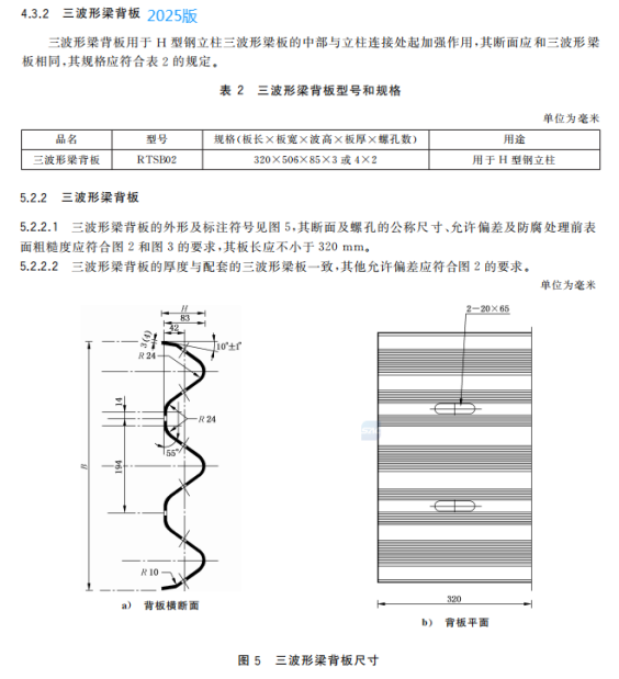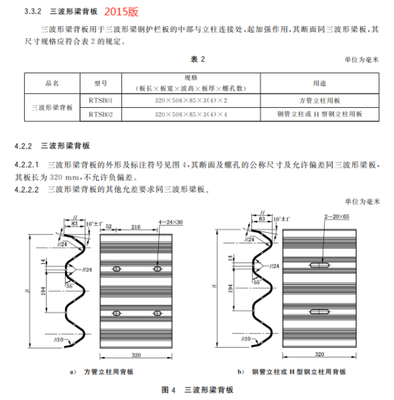 d) 更改了三波形梁板背板的用途、規(guī)格、尺寸和允許公差(見4.3.2、5.2.2,2015年版的3.3.2、4.2.2);