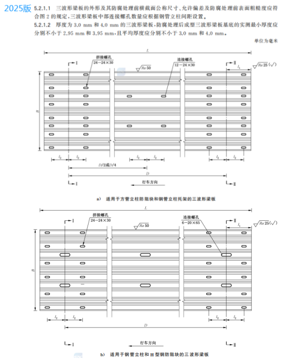 m) 增加了三波形梁板中部連接螺孔數量應根據鋼管立柱間距設置的要求、展開尺寸及允許偏差的要求(見5.2.1.1~5.2.1.3);