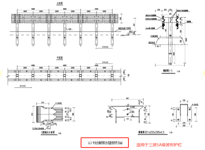 下面是組合型與分設型中央分隔帶護欄的設置參考大樣圖:
